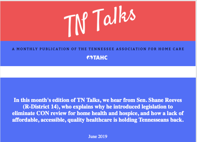 This past legislative session I introduced Senate Bill 547, which would have, among other things, eliminated the CON review for both home health and hospice in Tennessee. I chose to start with home health and hospice for the following two reasons: